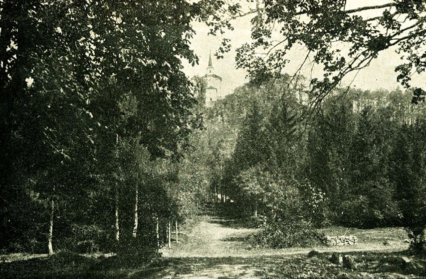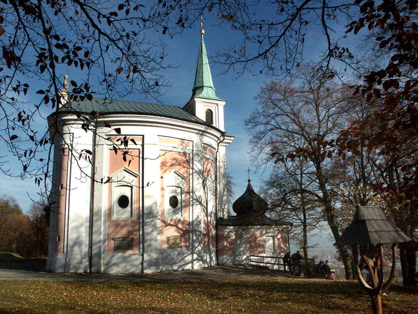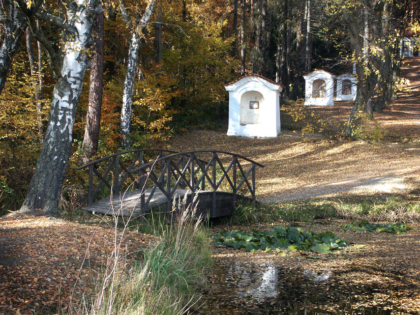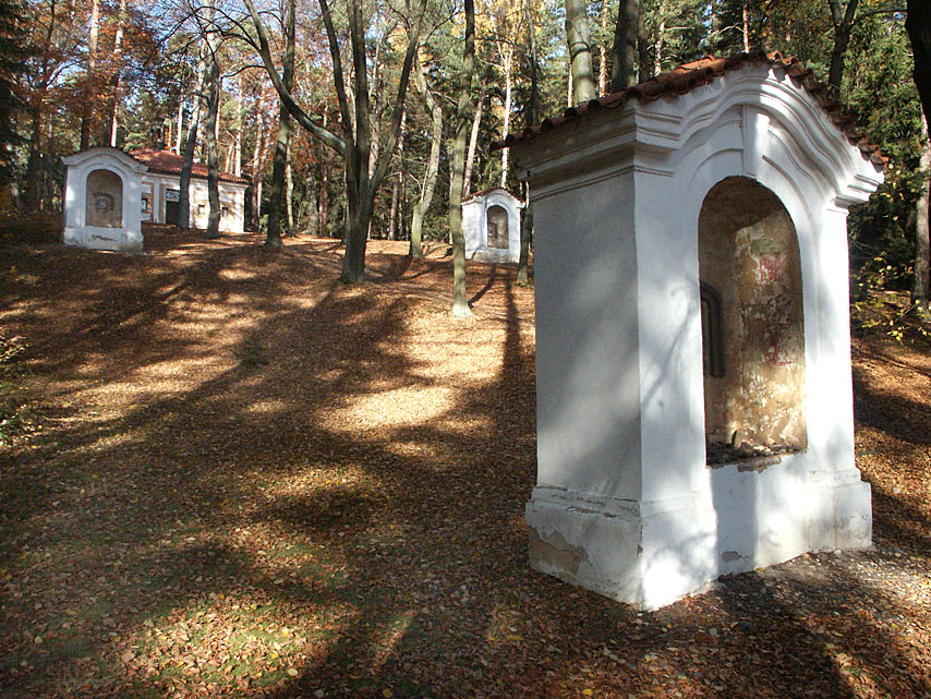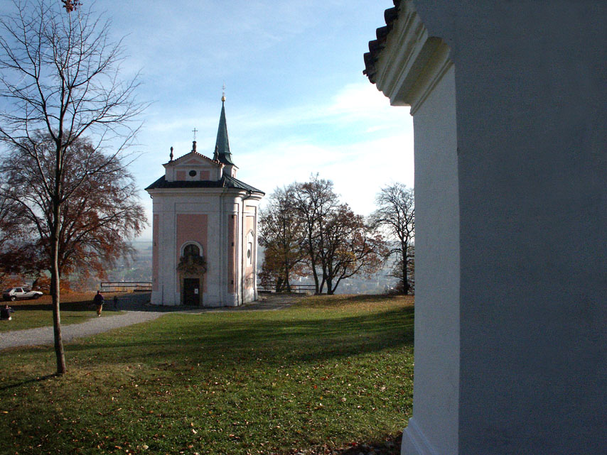 Pohled na kostelík od Mníšku v roce 1924 a modlitebna na vrcholu křížové cesty v roce 2005.
