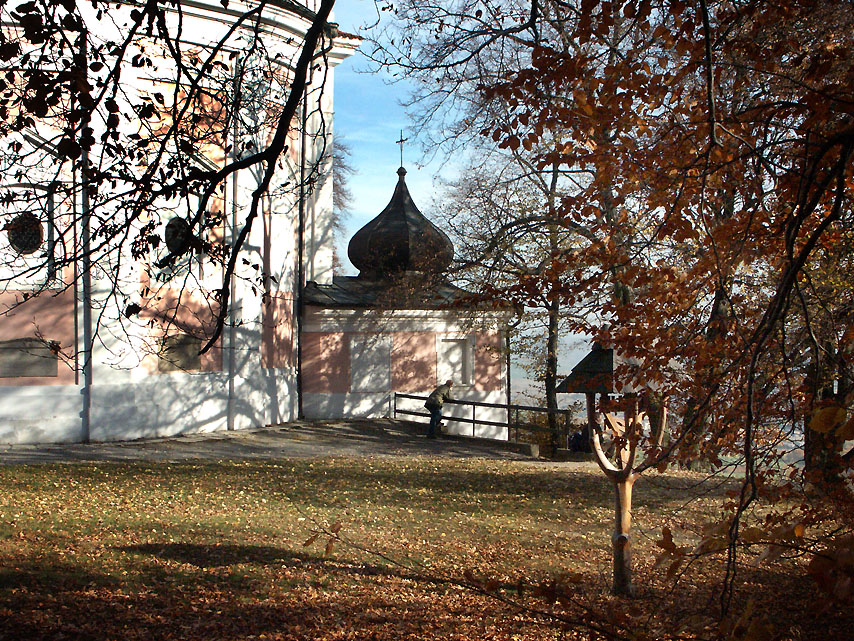Brandlův nástropní obraz: Máří Magdalena v jeskyni Marseillské v klášterním refektáři v roce 1924 a pohled na vrchní část křížové cesty v roce 2005.