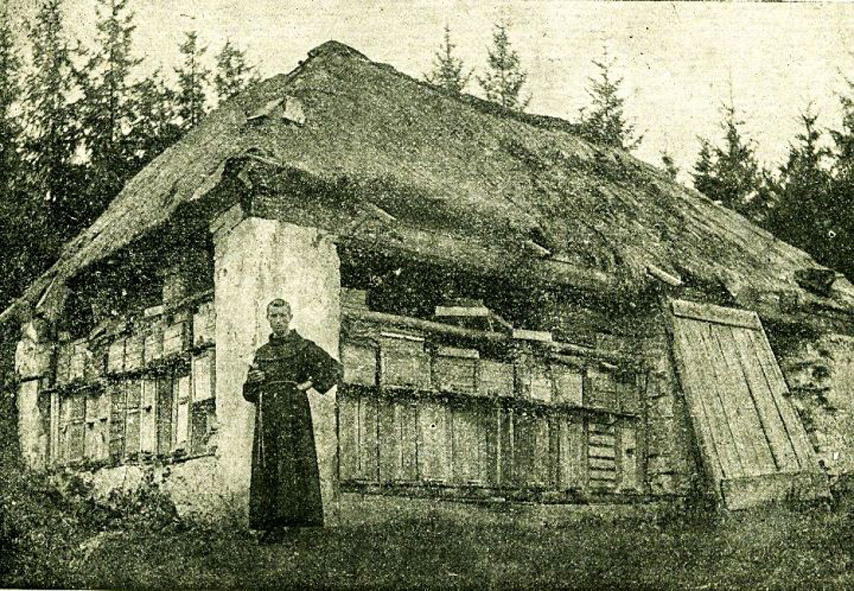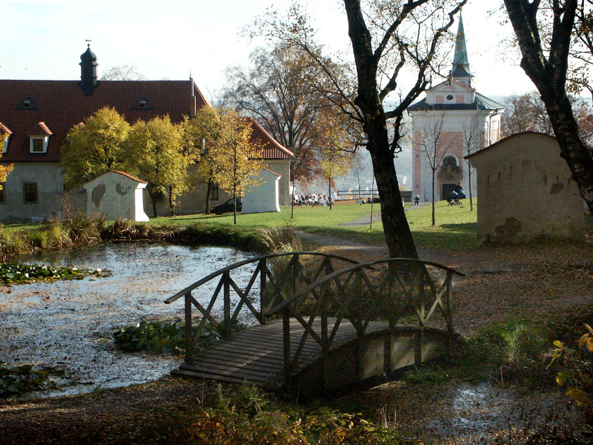 Na levém snímku je klášterní stodůlka a pozdější včelín, před nímž stojí páter L.Stojdl v roce 1924. Na pravém je pohled od jezírka na areál kostela a kláštera v roce 2005.