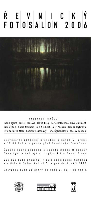 Město Řevnice a Občanské sdružení Dolní Berounka uspořádaly ve dnech 5.8. - 3.9.2006 v prostorách řevnického Zámečku a Galerie Salon No1 v Řevnicích výstavu čtrnácti fotografů nazvanou Řevnický Fotosalon 2006. Vystavující autoři Ivan Englich, Lucie Frantová, Jakub Frey, Marie Holečková, Lukáš Kliment, Jiří Milfait, Karel Neubert, Jan Neubert, Petr Packan, Helena Rytířová, Eva da Silva Melo, Ladislav Sitenský, Jana Šplíchalová a Václav Toušek pracují či žijí v okolí dolní Berounky. Slavnostní zahájení proběhlo 4.8.2006 v 19.00 hodin a úvodní slovo pronesl starosta města Miroslav Cvanciger, zahrála a zaspívala Alice Bauer Blues. Naše galerie dodala šest panelů s 24 fotografiemi Václava Touška.
