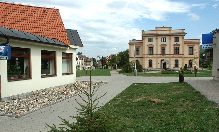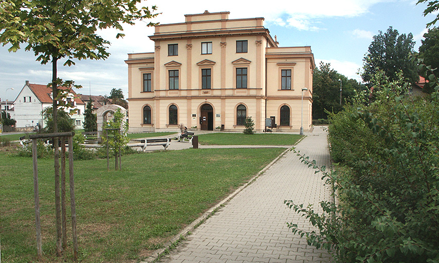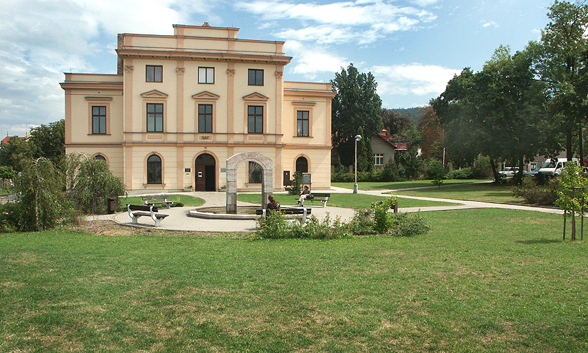 Řevnický zámeček a Galerie Salon No1 leží proti sobě, odděleni parčíkem s fontánou.